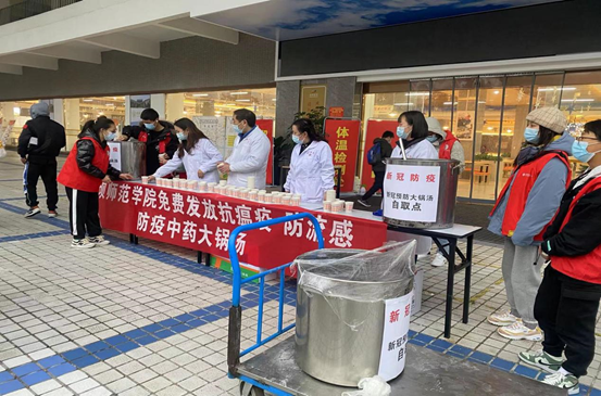 同时,校医院为了预防新型冠状病毒肺炎疫情和秋冬季节高发的瘟疫、流感等传染性疾病的发生,按照四川省中医药管理局、成都中医药大学预防方案拟定的“新型冠状病毒肺炎疫情预防方”中药汤剂熬制大锅汤,于11月14—16日期间在学校食堂门口设立起中药分发点,免费为全校师生发放中药预防汤剂,提高广大师生的免疫能力。