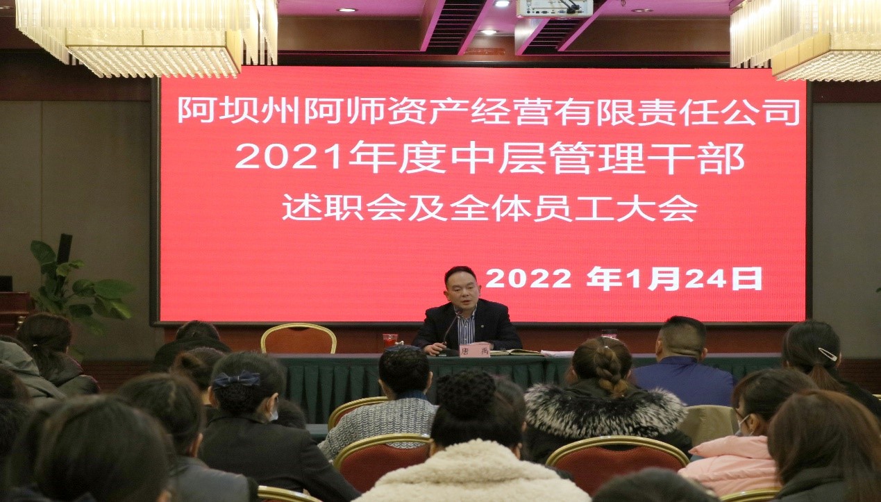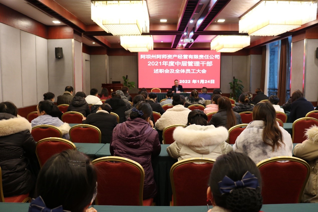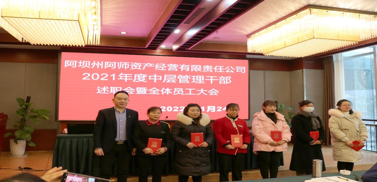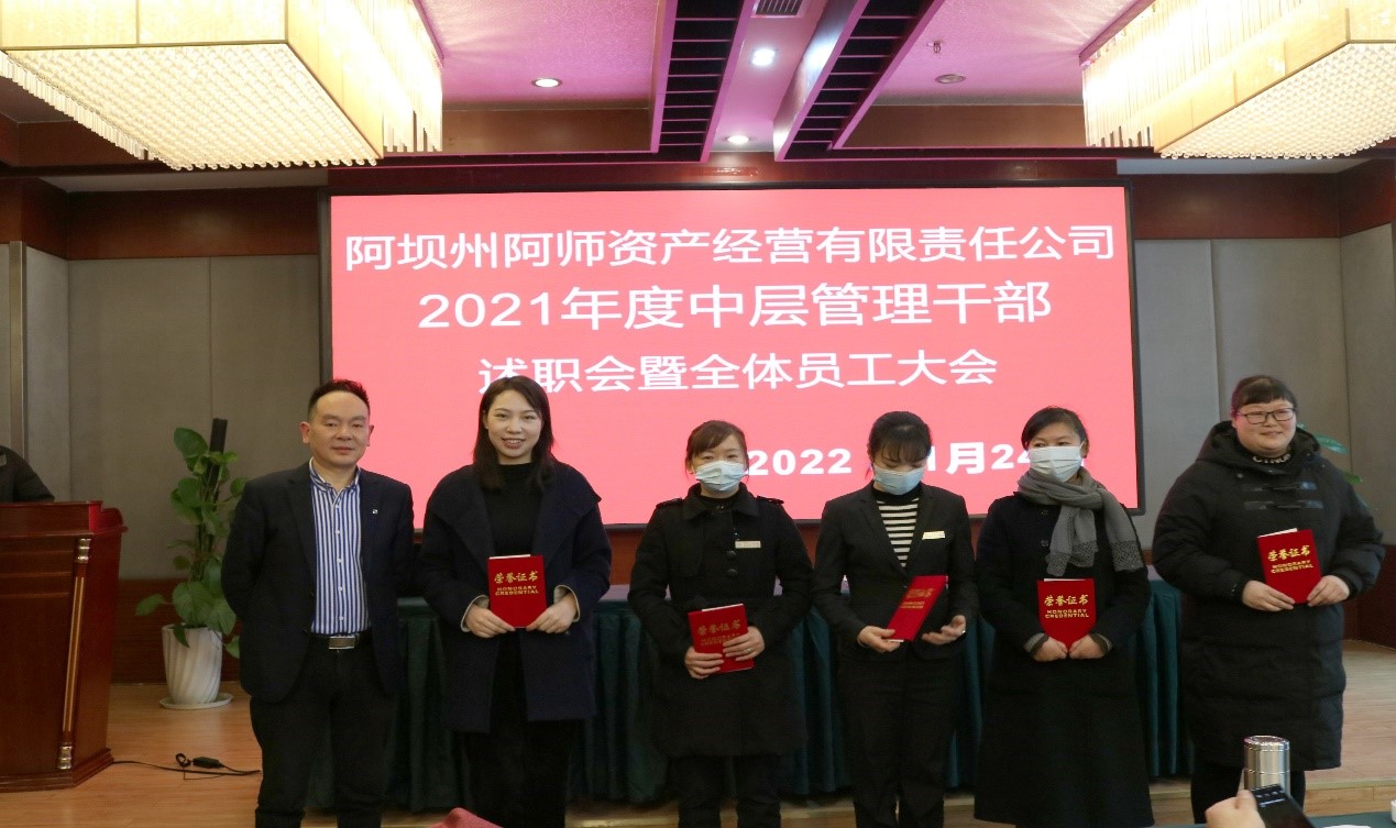 资产公司于2022年1月24日在梅朵天堂酒店二楼梅花厅会议室,召开公司中层管理干部述职暨公司全体员工大会,本次会议由公司总经理唐禹主持,公司所有非值班岗位上的员工均参加了本次会议。会议主要议程是:公司的中层管理干部述职活动、向被评选为2021年度的优秀员工进行表彰、向被评选为工会优秀干部、优秀会员、优秀家庭进行表彰。